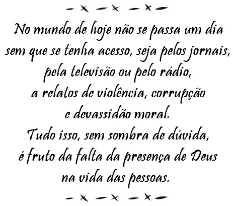 O grande desafio proposto a nós, cristãos, no mundo de hoje, é propagar o Evangelho de Jesus a todos, começando por dentro de casa. Não devemos nos intimidar com o que os outros vão achar, nem esmorecer na defesa dos ensinamentos de Cristo. Não importa se formos rotulados de carolas, ultrapassados. Temos de lutar contra o mal que se espalhou pelo mundo.